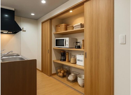 【イメージ画像です】 憧れのパントリーが付いています。引き戸になって食材も沢山ストックできます。来客時にはサッと隠すことができて大変便利です。 (棚は別途料金で取り付け可能です)