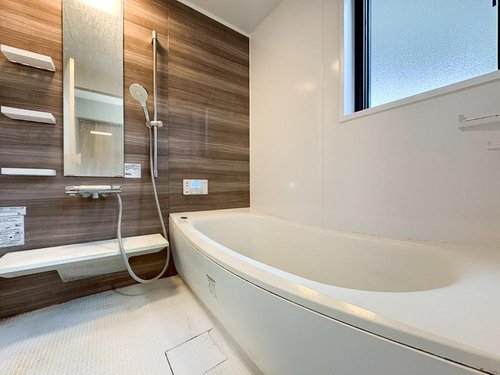 【クリーニングして綺麗になりました】 アクセントクロスがモダンな印象の浴室です。大きな浴槽で楽しいバスタイムを♪