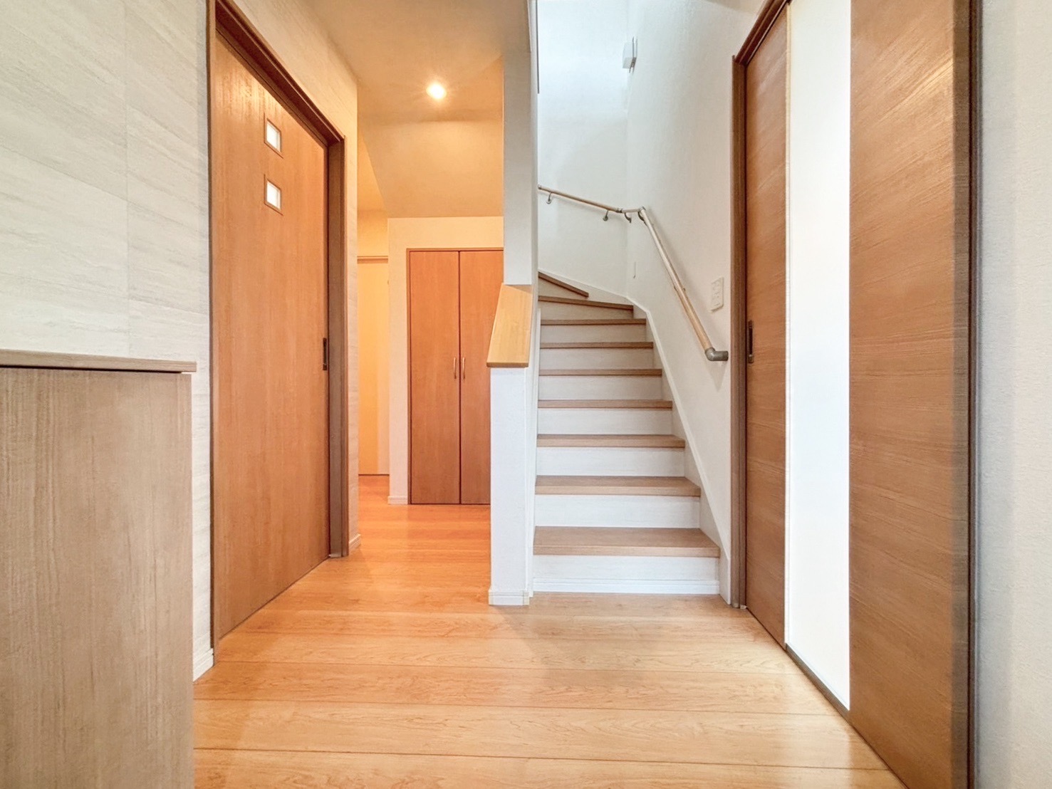 【天井・壁クロス張替えで綺麗になりました】階段にも光が差し込む明るい玄関です。