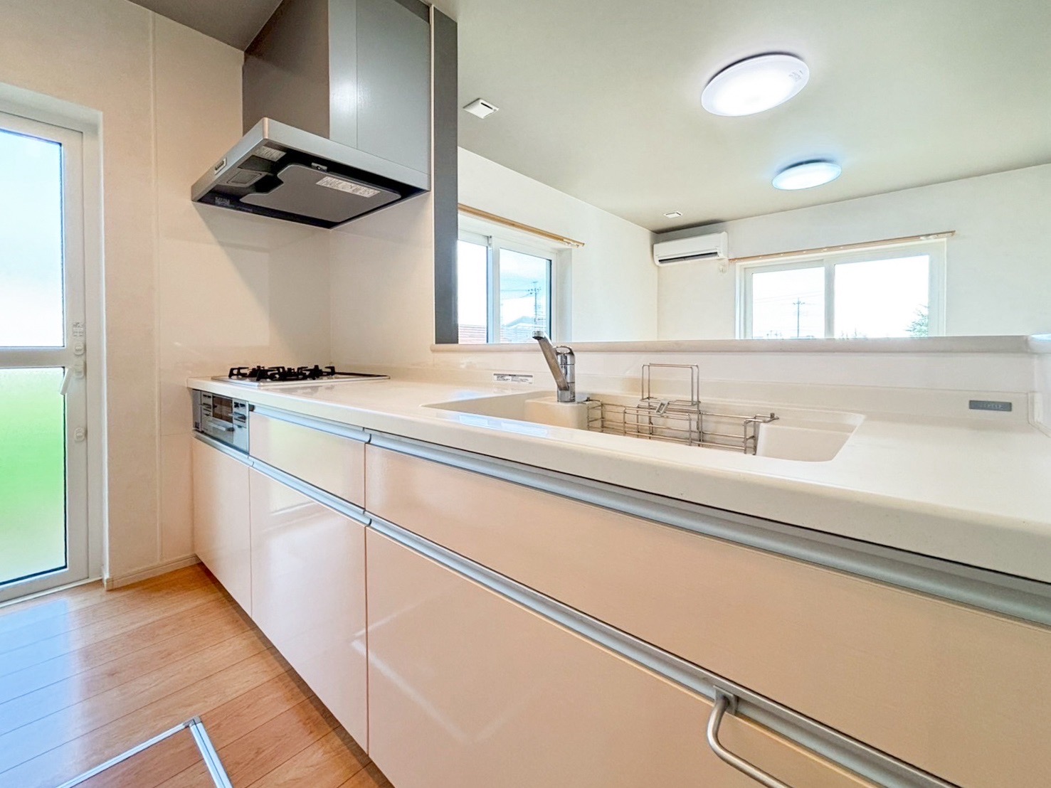 【天井・壁クロス張替えで綺麗になりました】 リビングが見渡せるカウンターキッチンです。 背面には同系色で揃えた食器棚があります。 収納はたっぷりです。