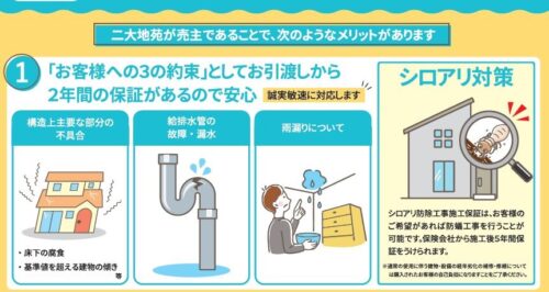 「お客様への3の約束」 (1)構造上主要な部分の不具合(床下の腐食、建物の傾き等) (2)給排水管の故障 漏水 (3)雨漏りについてお引渡しから2年間の保証があるので安心、誠実敏速に対応します。