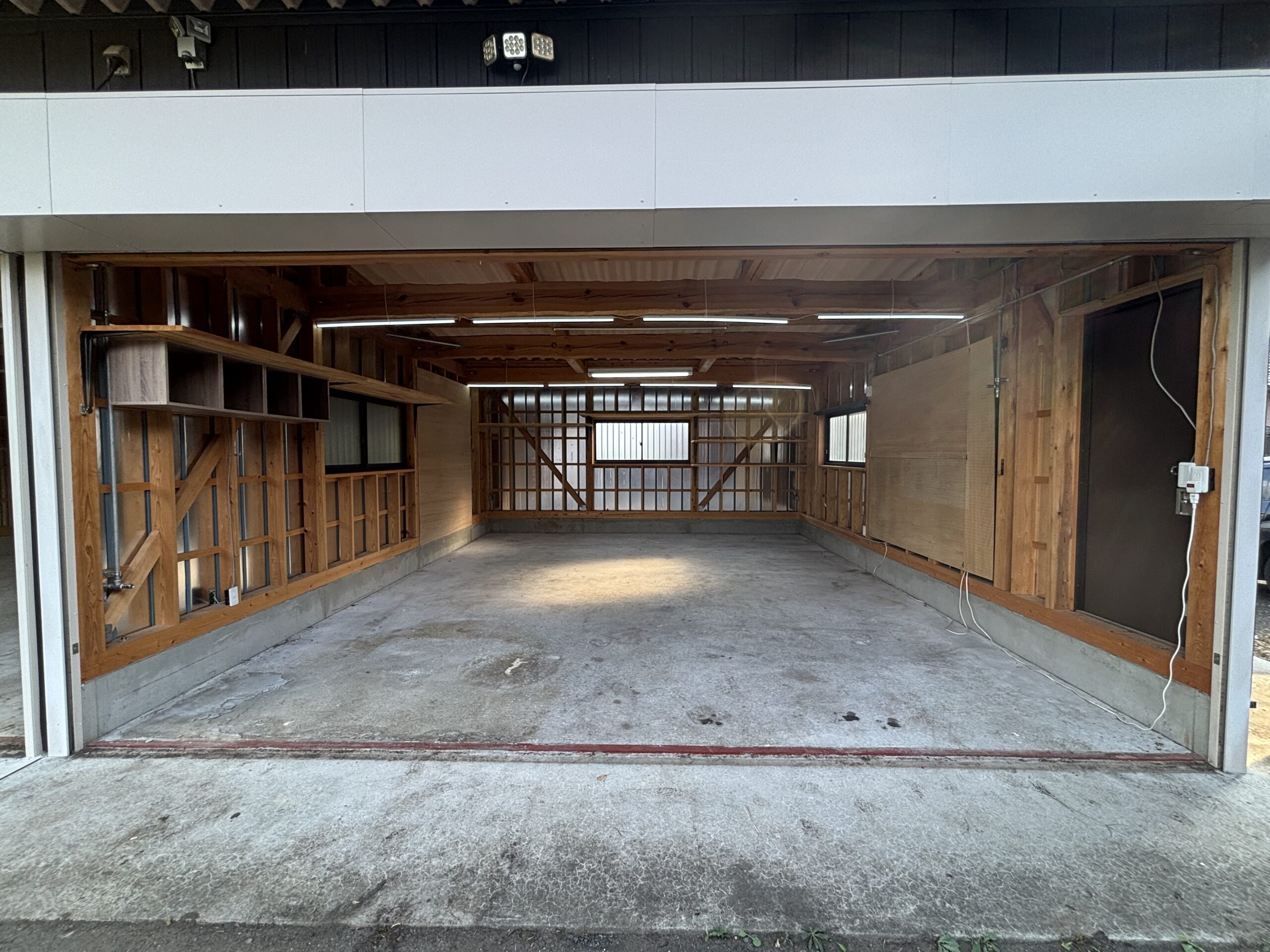 南側にガレージがあります。趣味のバイクや、自転車いじりなどにお使いいただけます。お車を2台並列で置ける広さがあります。