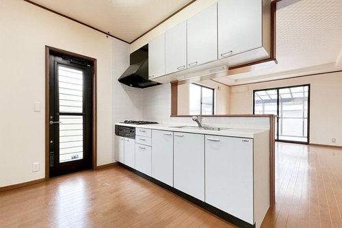 【リフォームしたCG画像です】頭上にも収納があるシステムキッチンです。クロス張替え、ハウスクリーニングで綺麗にします。カウンターになっているので、調理中や片付け中も家族と自然な会話ができます。
