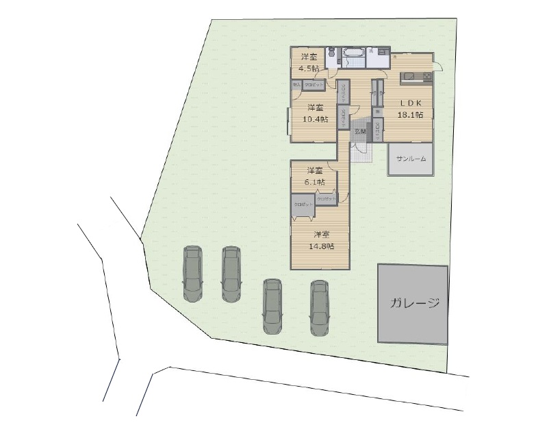 【駐車場の配置イメージ図です】 並列で4台駐車可能です。大きな車も楽々駐車する事ができます。お庭で洗車もできちゃいます♪