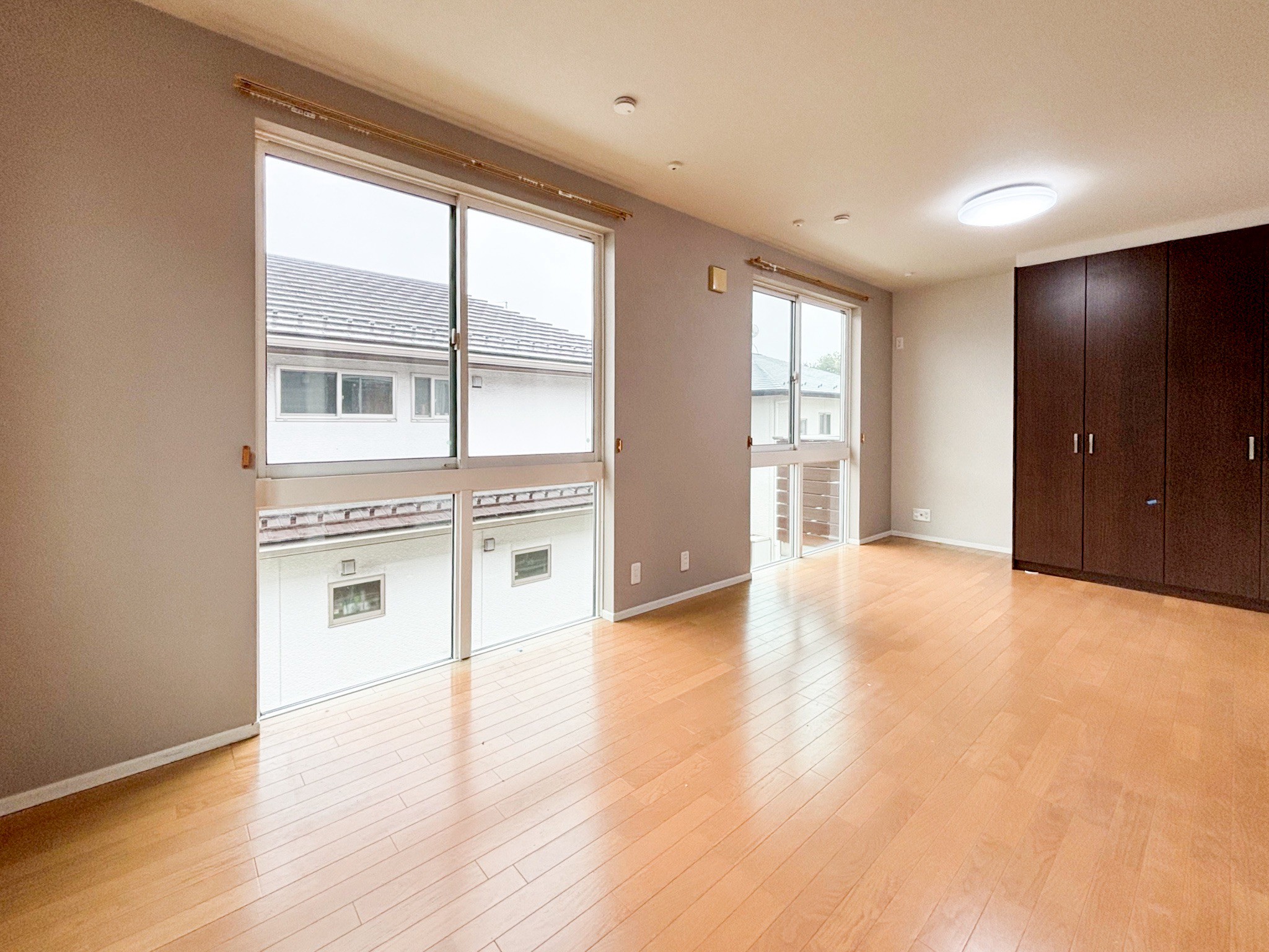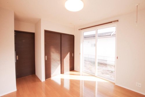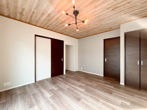 【リフォーム後】2階11帖の洋室です。 クロス張替えで綺麗になりました。将来、分割できるようにドア、窓、収納左右それぞれに設置してあります。