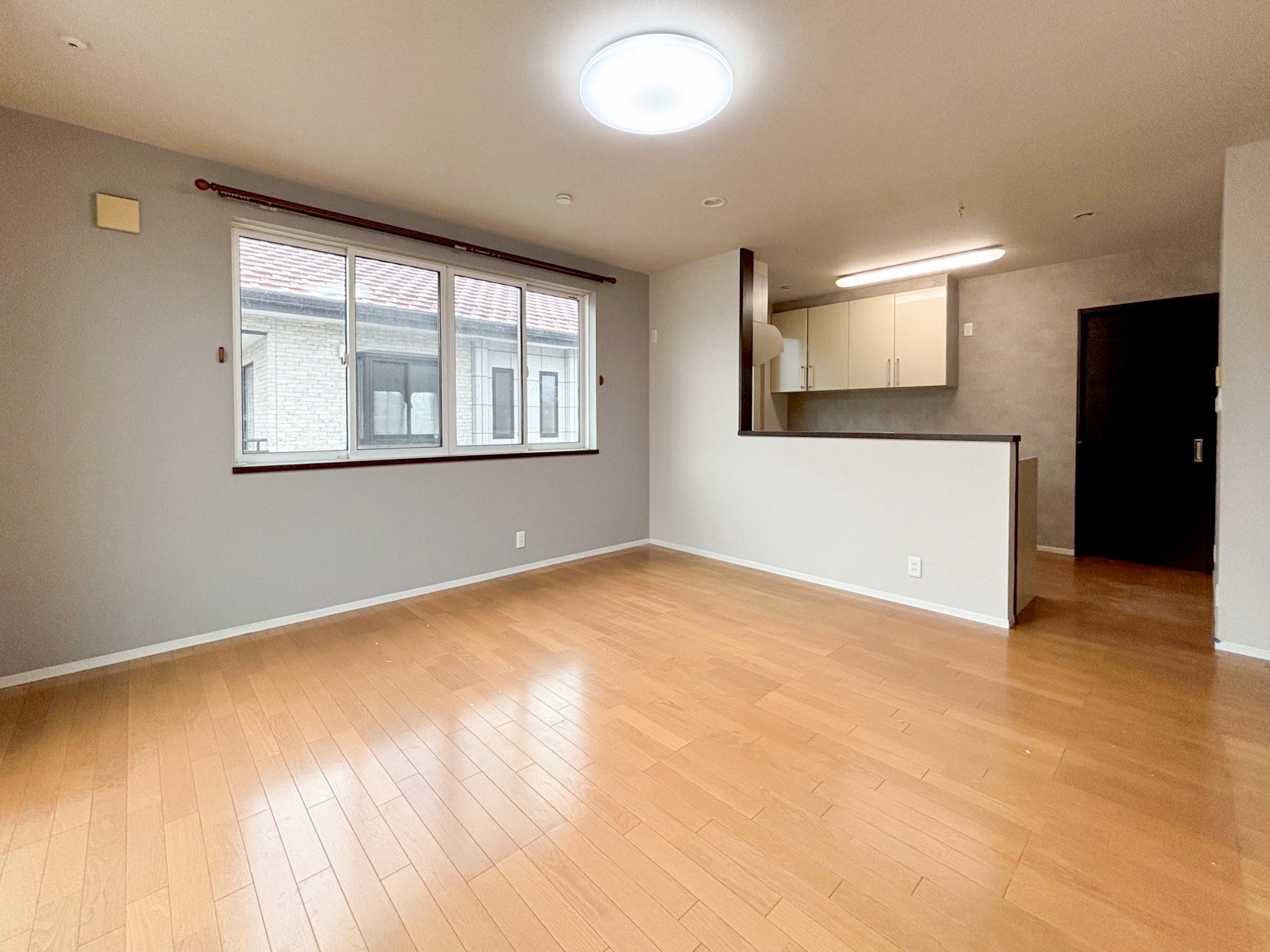 【リフォーム後】1階LDKです。クッションフロア上張り、クロス壁・天井張替え、LED照明が付いて綺麗になりました。 南向きに掃き出し窓があるので明るい光が差し込むお部屋になります。