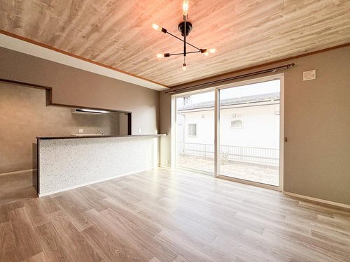 【リフォーム後】1階LDKです。クッションフロア上張り、クロス壁・天井張替え、お洒落なLED照明が付いて綺麗になりました。 南向きに掃き出し窓があるので明るい光が差し込むお部屋になります。