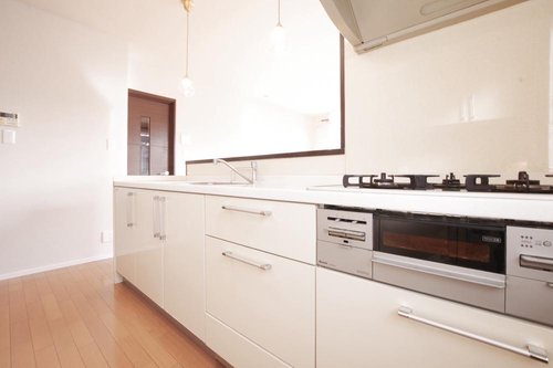 【リフォーム後】 2階キッチンです。 クロス張替え、キッチンコンロ交換で綺麗になりました。 対面式キッチンで家族との会話を楽しみながらお料理ができますね。