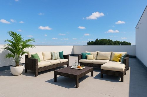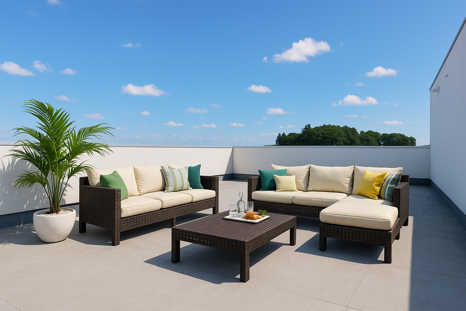 【屋上イメージ画像】 屋上に家具を配置したイメージ画像です。 広い屋上で視界をさえぎるものがないので、気持ちいい自分たちだけの世界を楽しめそうですね♪