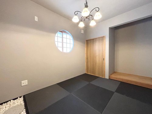【リフォーム完了】 一部クロス張替え、クリーニングで綺麗になりました。 1階4.6帖の茶室です。 お部屋には丸い窓もついていて、デザイン性の高いおしゃれな茶室になっています。
