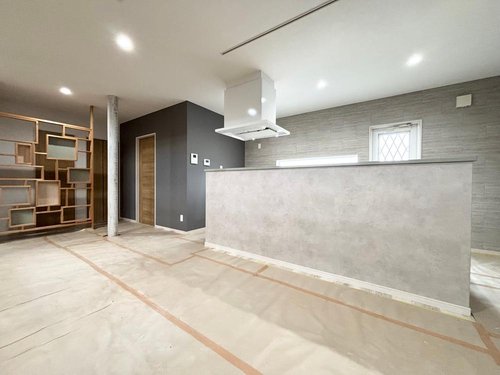 【リフォーム中】 これから一部クロス張替え、クリーニングで綺麗になります。 リビングからアイランドキッチンを見た写真です。トイレ前の隠し棚もお洒落で手が込んでいます。