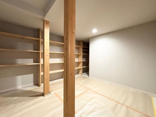 【リフォーム中】 一部クロス張替え、クリーニングで綺麗になりました。1階キッチン横の物入スペースです。整理棚も付いてたっぷり収納できます。ゴミ収集日までの一時置き場としても便利です。