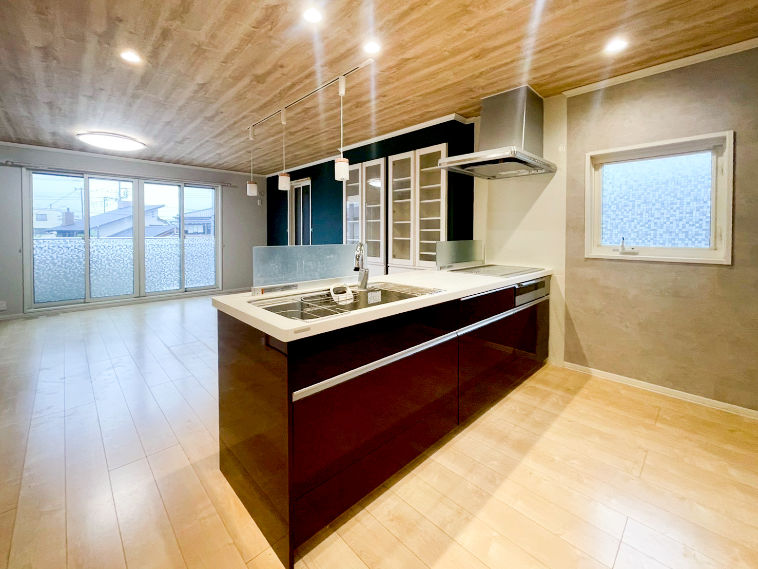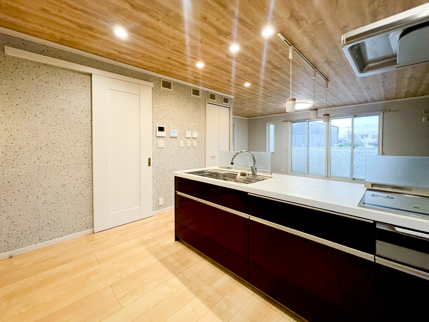 【リフォーム中】 クロス張替えは完了、これからクリーニングしてお引渡し致します。 ダークなワインレッドカラーのカウンターキッチンです。ご家族との会話を楽しみながらお料理できます♪