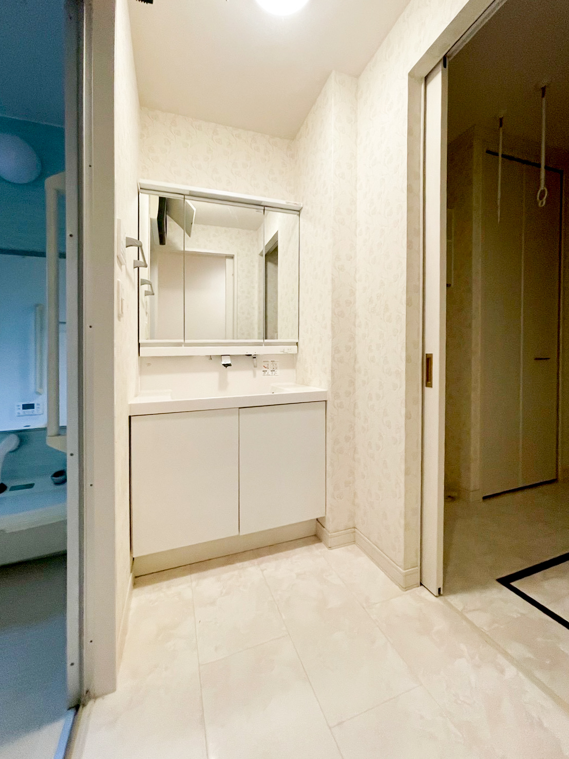 【リフォーム前】 クロス張替え、クリーニングしてお引渡し致します。大きな三面鏡が付いた収納たっぷりの洗面化粧台です。