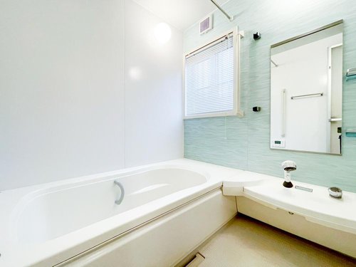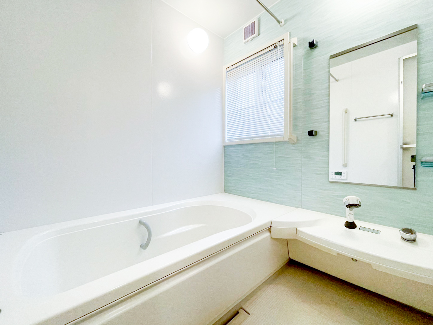 【リフォーム前】 クリーニングしてお引渡し致します。 広々1坪タイプの浴室です。ミントグリーンのアクセントクロスで爽やかなバスタイムを♪