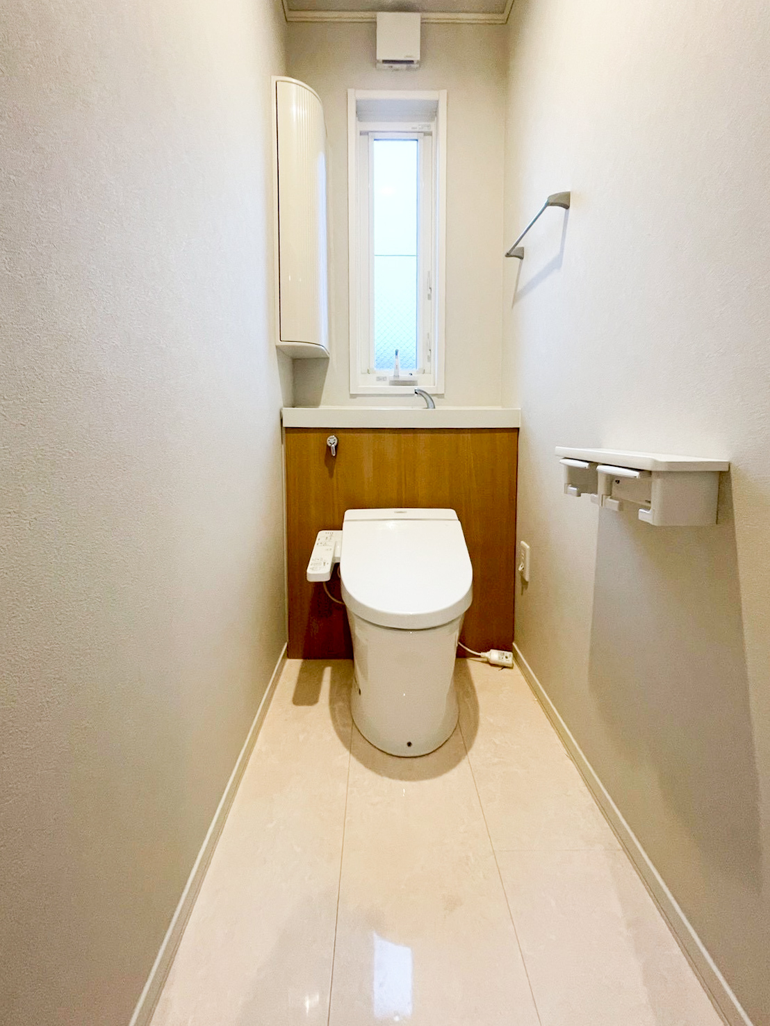 【リフォーム中】 クロス張替えは完了、これからクリーニングしてお引渡し致します。手洗い場も付いて清潔です。 物入も沢山で、ペーパー類やお掃除道具など整理整頓できます。