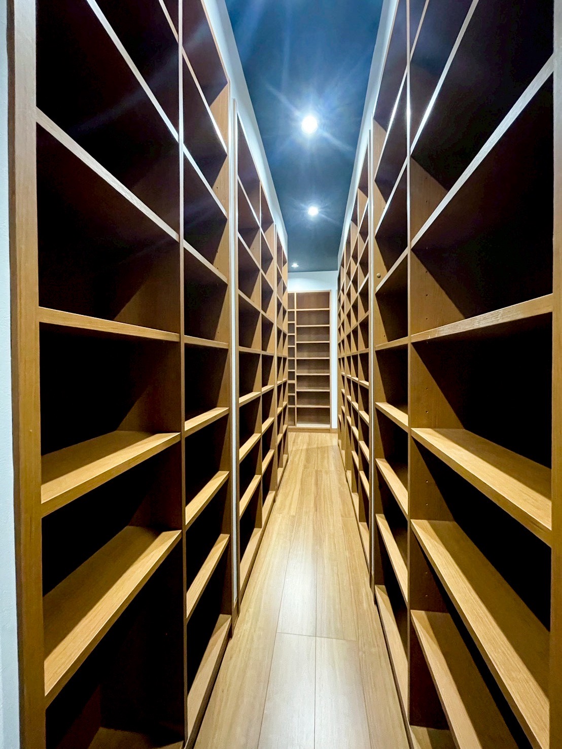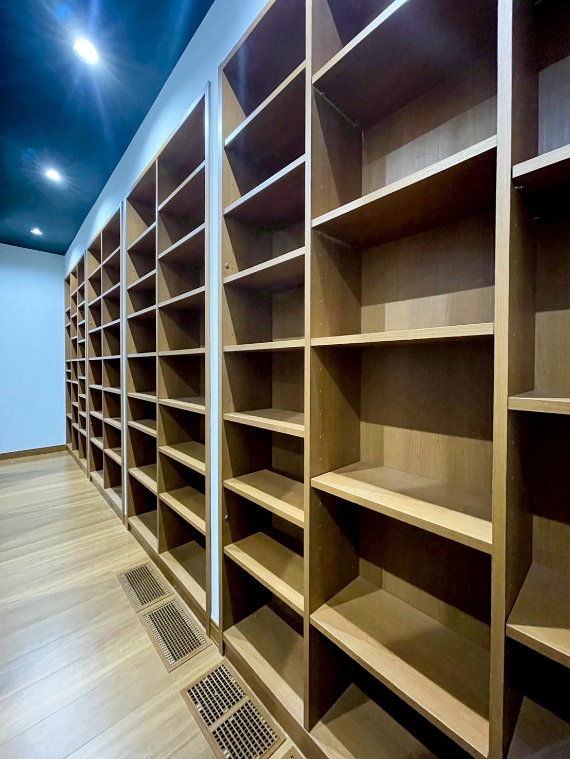 【リフォーム後】 クロス張替えしました。1階書庫です。本好きにはたまらない圧巻の書棚が並びます。マンガ、専門書、写真集、画集など、一日中こもりたくなる空間です。