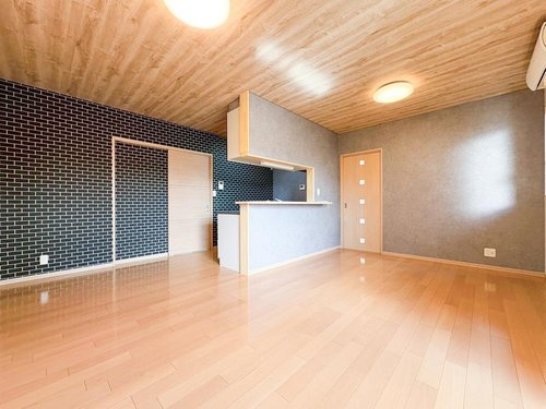 【クロス張替え・クッションフロア上張り・ハウスクリーニングで綺麗になりました】2階LDKです。キッチン裏のタイル風クロスがまるでカフェのような雰囲気になります。