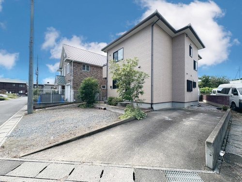 前面道路から見た外観です。車は4台駐車可能です。交通量も少ないので安心して駐車ができます。屋根付きカーポートや、ガレージも置ける広さです。