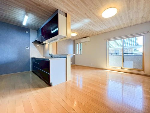 【クロス張替え・クッションフロア上張り・ハウスクリーニングで綺麗になりました】2階LDKです。天井クロスまでこだわって仕上げました。掃き出し窓から入る日差しで明るいLDKです。