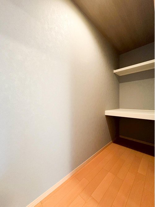 【クロス張替え・クッションフロア上張り・ハウスクリーニングで綺麗になりました】1階キッチン裏のパントリーです。作り付けの棚も付いて、生活感のあるものをまるっと収納できますね。