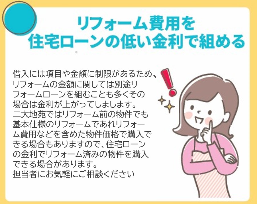 【リフォーム費用も住宅ローンに含める】 リフォーム前の物件でも、リフォーム費用を含めた価格で住宅ローンを組める場合がございます。 詳細はお気軽にお問い合わせください♪