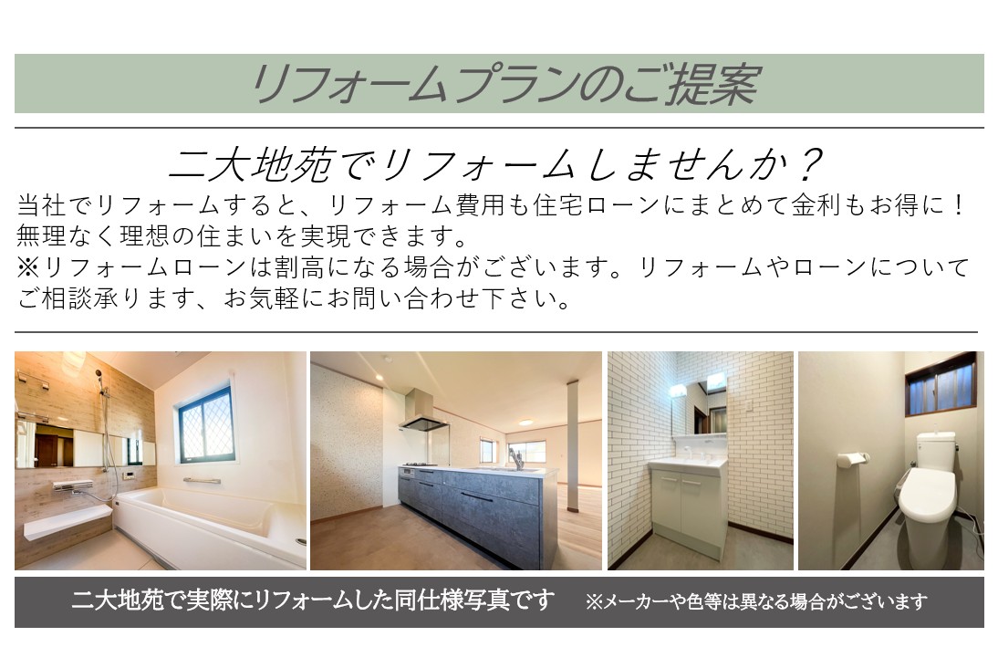リフォームプランもご提案できます! クロス張替え、水回り新品交換他、リフォームのご相談承ります。 リフォーム費用も含めて住宅ローンの低い金利で組める場合がございますので、お気軽にお問い合わせください♪
