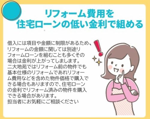 リフォーム前の物件でも、リフォーム費用を含めた価格で住宅ローンを組める場合がございます。 詳細はお気軽にお問い合わせください♪