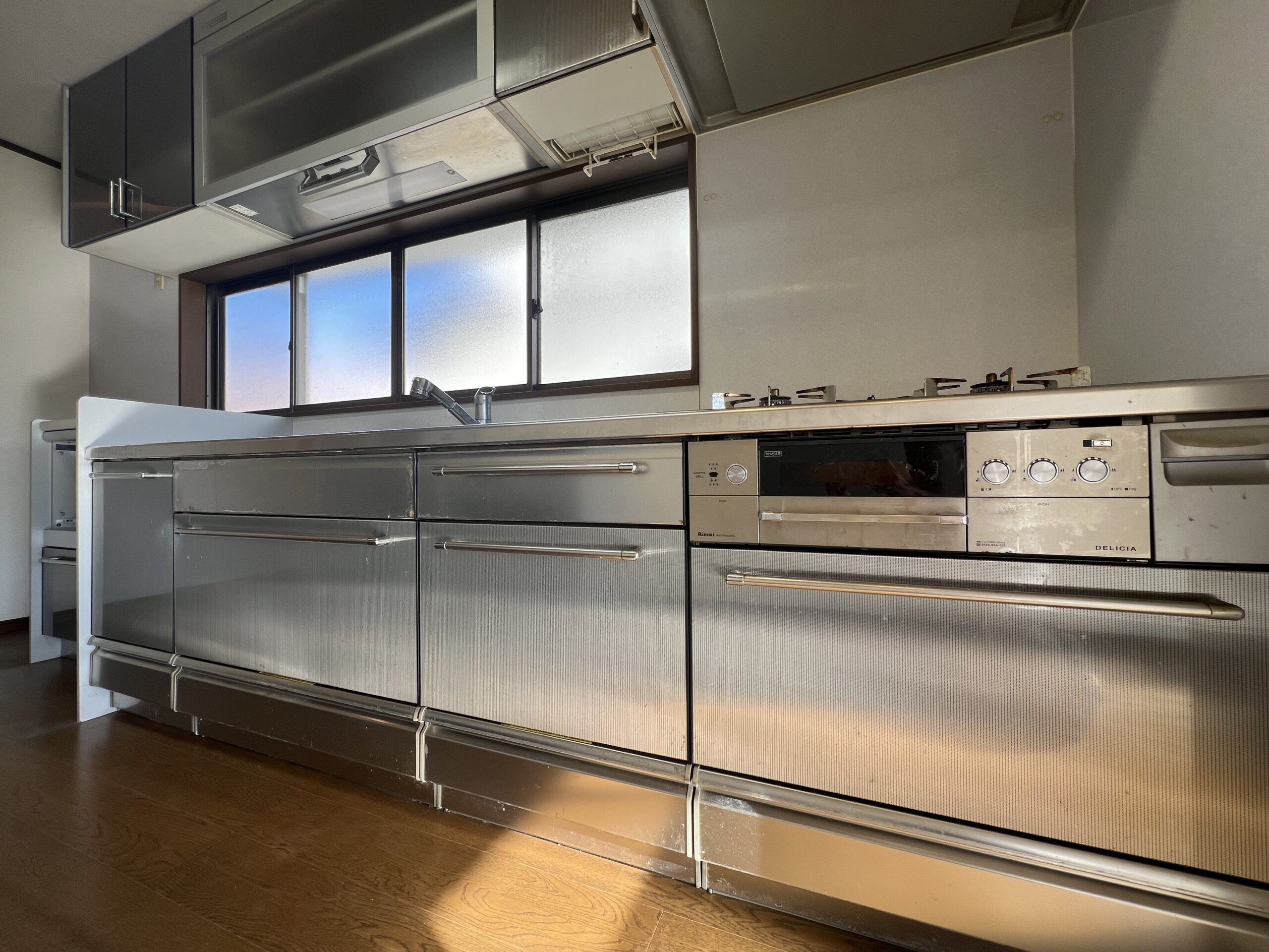 オールステンレス製のシステムキッチンです。無機質でシャープな印象です。まるで飲食店の厨房のような“プロ感”を演出できます。頭上にも収納があり、ホットプレートや、普段使いしないものも沢山収納できます。