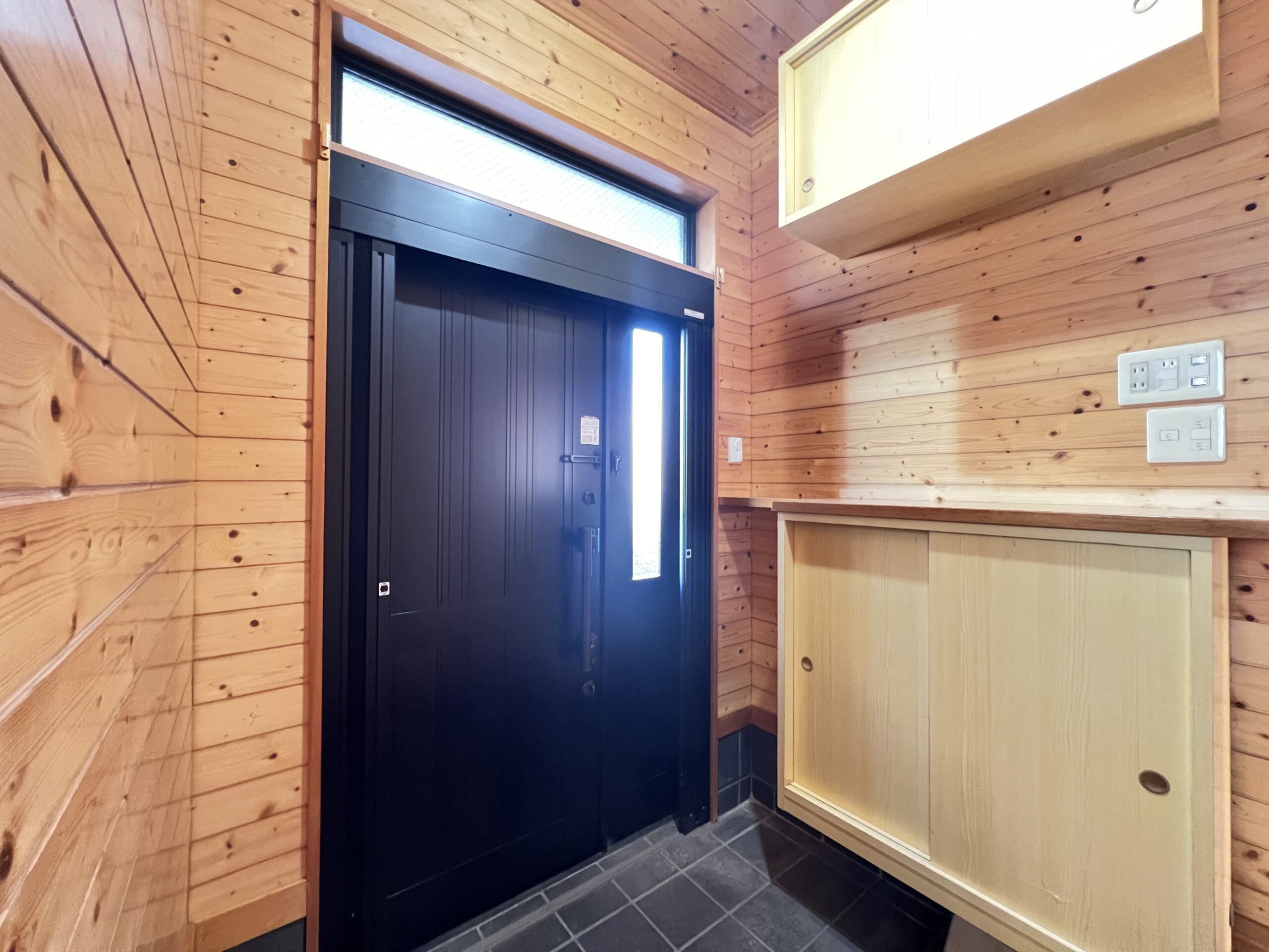 板張りの壁が山小屋のような雰囲気を演出しています。明かり取り窓からもしっかり日差しが入り、明るく爽やかな玄関です。シューズBOXも上下で容量たっぷりです。