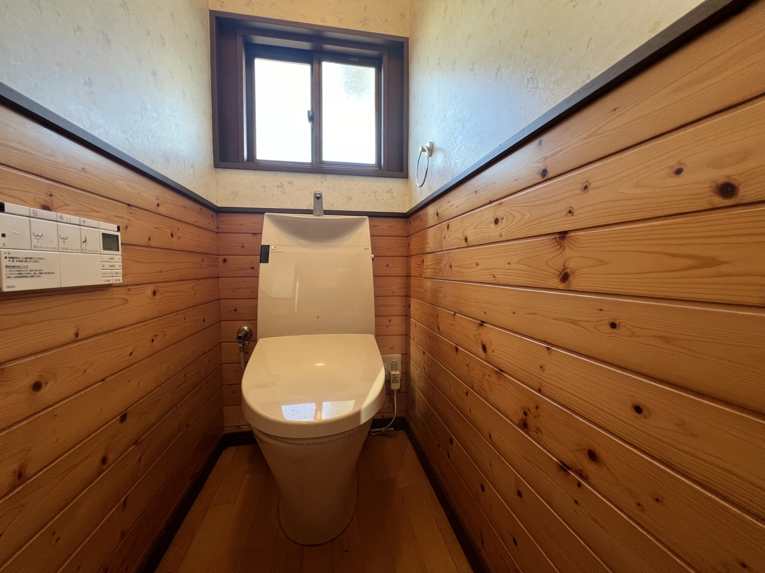 温水洗浄便座です。寒い冬でも、板張りの壁が温かみを感じます。リフォームのご相談も承ります。お気軽にご相談下さい。