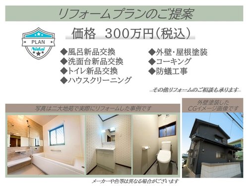 リフォームプランのご提案です。 追加200万円で風呂・トイレ・洗面新品交換、外壁・屋根塗装、コーキング、防蟻工事のリフォームが可能です。 リフォームに関してのご相談もお気軽にお問い合わせください♪
