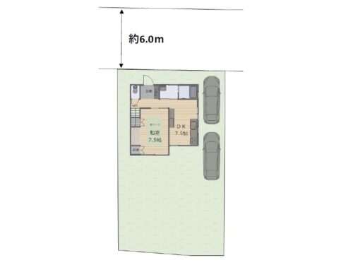 【駐車場イメージ図】 駐車場の車配置イメージ図です。 縦列で2台、駐車可能です! 前面道路が6mあるので運転が苦手な方にも安心の広さがあります。