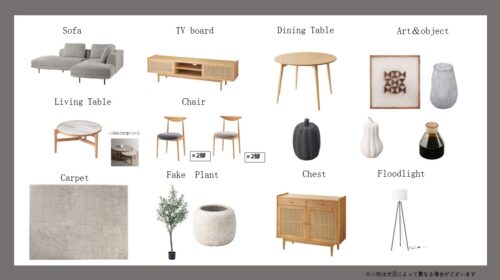 【LDKに家具を配置したイメージ画像です】 張替えしたクロスのイメージにあわせて北欧風の家具を配置してみました。 ※実際に家具は付きません。