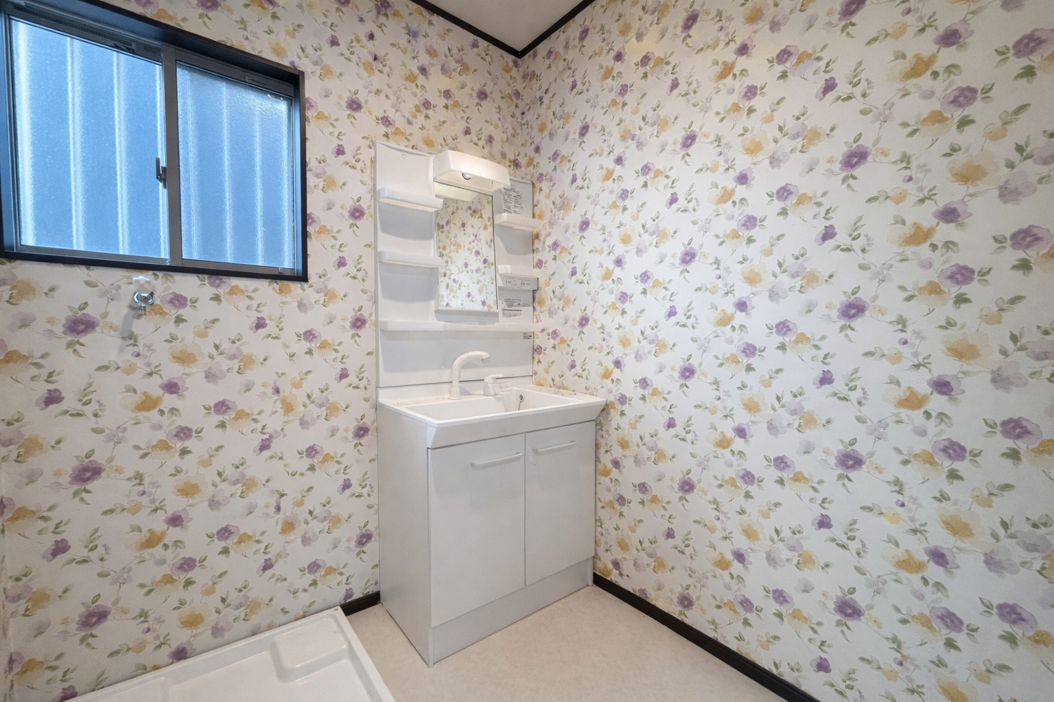 【リフォーム前】 クロス張替え、ハウスクリーニングで綺麗にします。洗面化粧台にはシャワーハンドルが付いているので、朝シャンやお掃除にとても便利です。