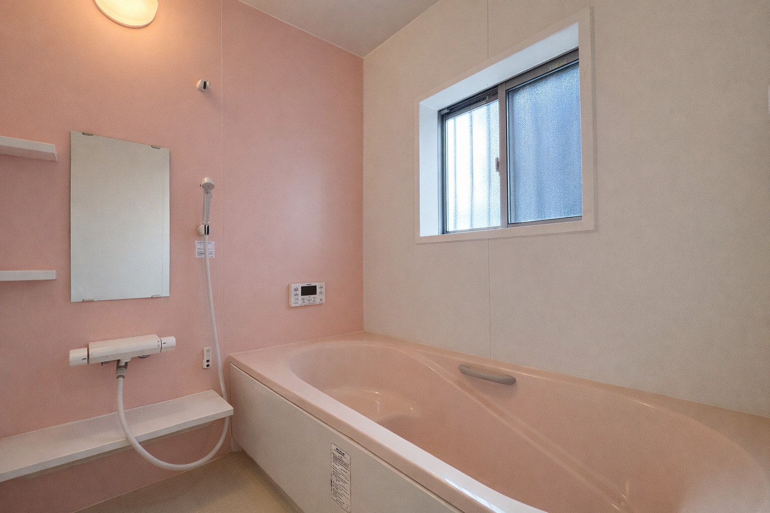 【リフォーム前】 ハウスクリーニングで綺麗にします。 大きな浴槽が付いた明るいバスルームです。腰掛けが付きの浴槽なのでお子様との入浴や高齢者の足腰の負担軽減にもとても嬉しいですね。
