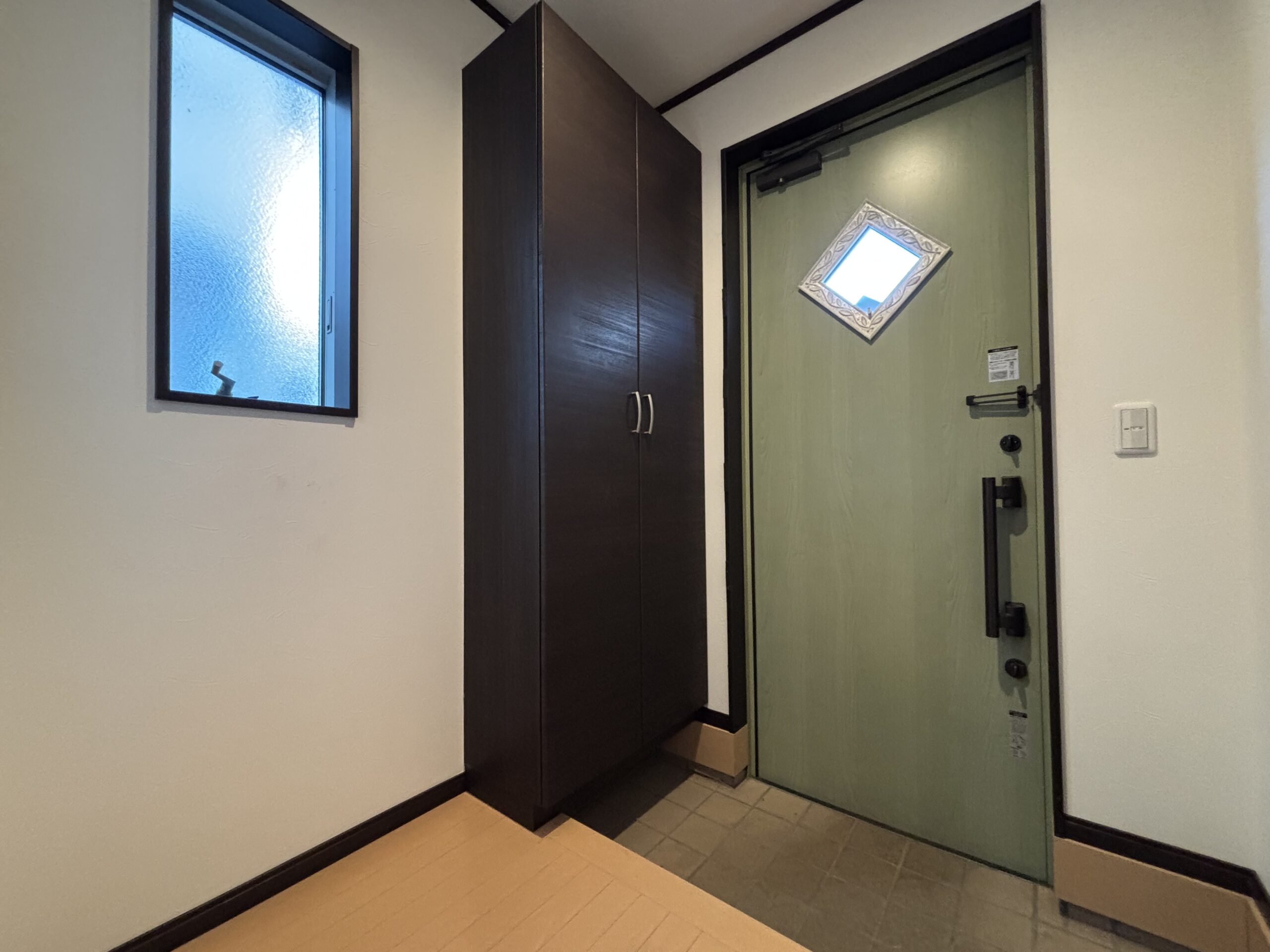 【リフォーム前】 クロス張替え、ハウスクリーニングで綺麗にします。天井まである大容量のシューズボックスが付いています。淡いグリーンの玄関ドアがお洒落です。