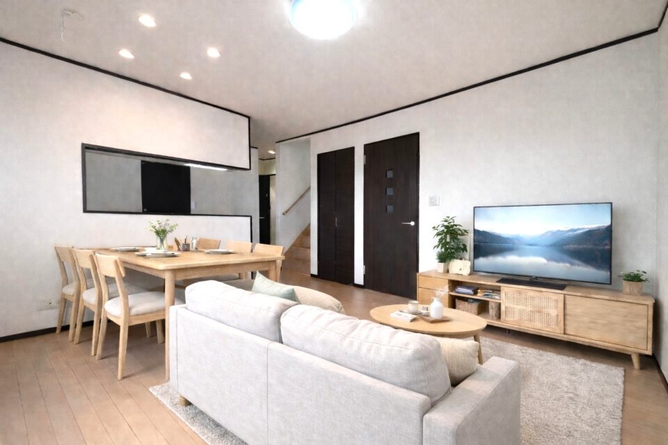 【リビングイメージCG画像】 リビングに家具を配置したイメージCG画像です。 リビングイン階段で家族とのコミュニケーションが取りやすい間取りです。
