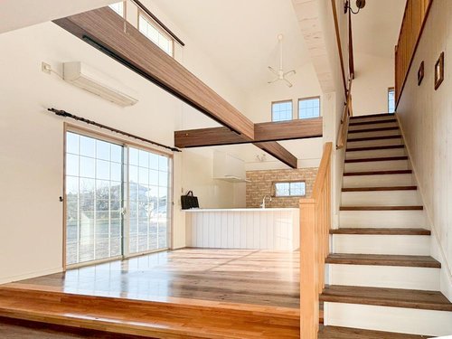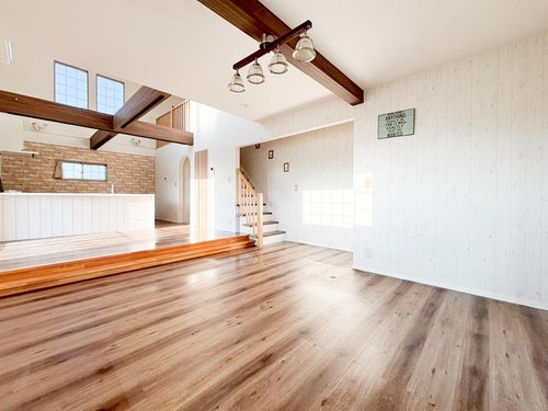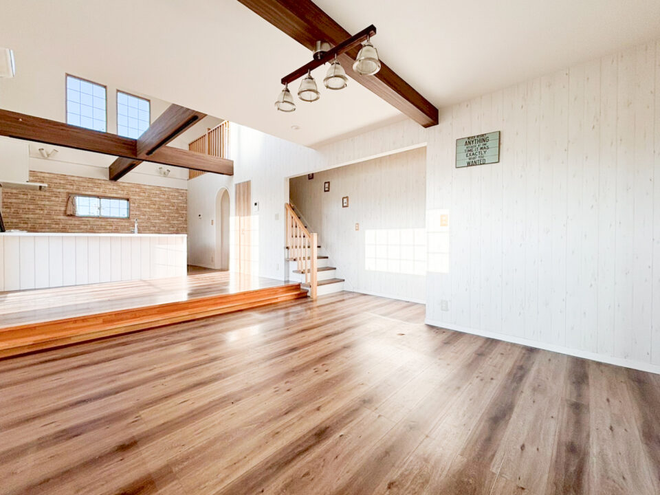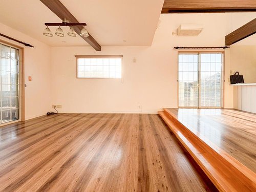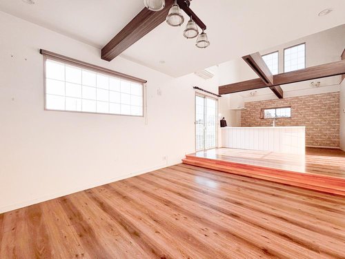 【リフォーム前】 これからクロス張替え、クリーニングできれいになります。 LDKは吹抜けで21帖のワイドスパン! 存在感ある梁がアクセントになるおしゃれなリビングです。