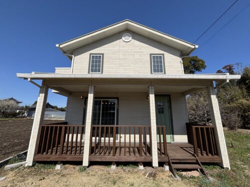落ち着いたベージュの外壁に、深いグリーンの屋根。アメリカンな雰囲気があり、遠くから見ても “絵になる家” です。
