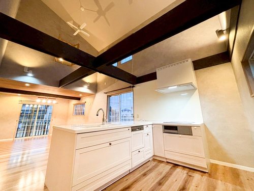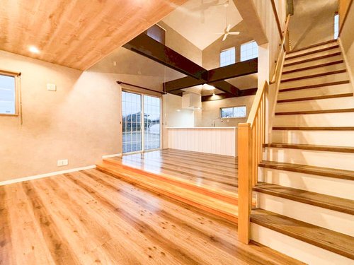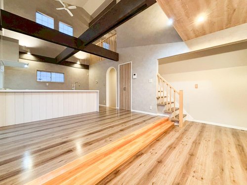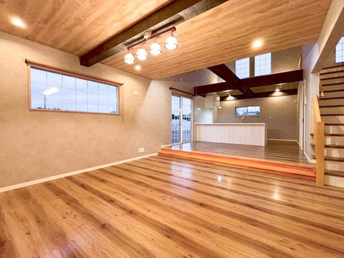 【リフォーム完了】 クロス張替え、クリーニングが完了し、きれいになりました。 LDKは吹抜けで21帖のワイドスパン! 存在感ある梁がアクセントになるおしゃれなリビングです。ムク材のフローリングのLDKは木のぬくもりに包まれ、深呼吸したくなるリビングです。
