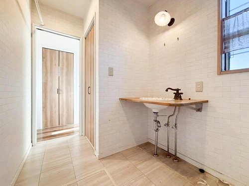 【リフォーム完了】 クロス張替え、クリーニングが完了し、きれいになりました。 カウンターが映える、優しい洗面空間。 木目調で心地いい洗面スペースです。