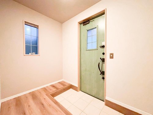 【リフォーム完了】 クロス張替え、クリーニングが完了し、きれいになりました。 深いグリーンの屋根にあわせたドアでアメリカンな雰囲気がいいですね。