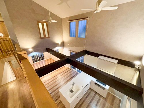 【リフォーム完了】 クロス張替え、クリーニングが完了し、きれいになりました。 リビングの上が吹抜けになっています。 存在感ある梁がアクセントになっていて広い空間が広がります。