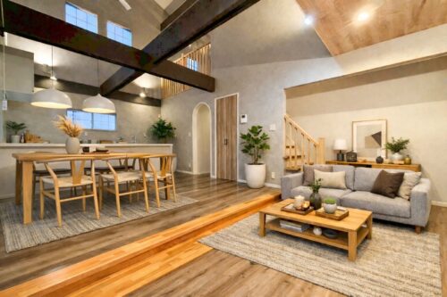 【家具を配置したイメージ画像です】 リビングに家具を配置したイメージCG画像です(※実際に家具は付いてきません) 梁と無垢調が映え、木の温もりに包まれるお部屋が心地良いリビングです。