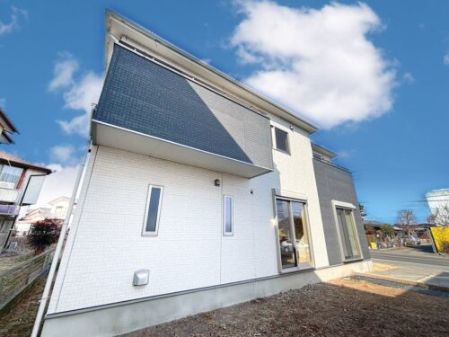 白×ダークグレーの外観がモダンな外観です。陽当たり・デザイン性・開放感・駐車スペース・広い庭の5つを叶えた邸宅です。