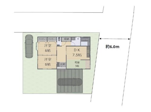 【駐車場イメージ図】 駐車場の車配置イメージ図です。 2台駐車可能です。 1台分は玄関とつながるカーポート付きなので雨の日も快適。