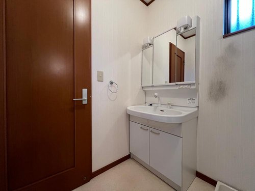 【リフォーム前】 クロス・クッションフロア張替え、照明取付、クリーニング等をこれから行ってきれいになります。 伸びるシャワーヘッド付きで洗面・掃除がとても便利です。