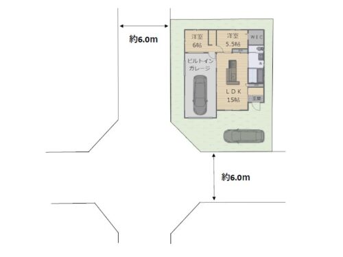 【駐車場イメージ図】駐車場の車配置イメージ図です。車はビルトインガレージに1台、カースペースに1台で計2台駐車可能です。