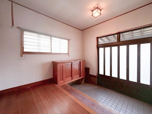 【これからハウスクリーニングできれいになります】 和の風格を感じる引き戸玄関です。 屋根付きで雨の日も出入りがしやすく、和の趣と安心感を兼ね備えた住まいです。